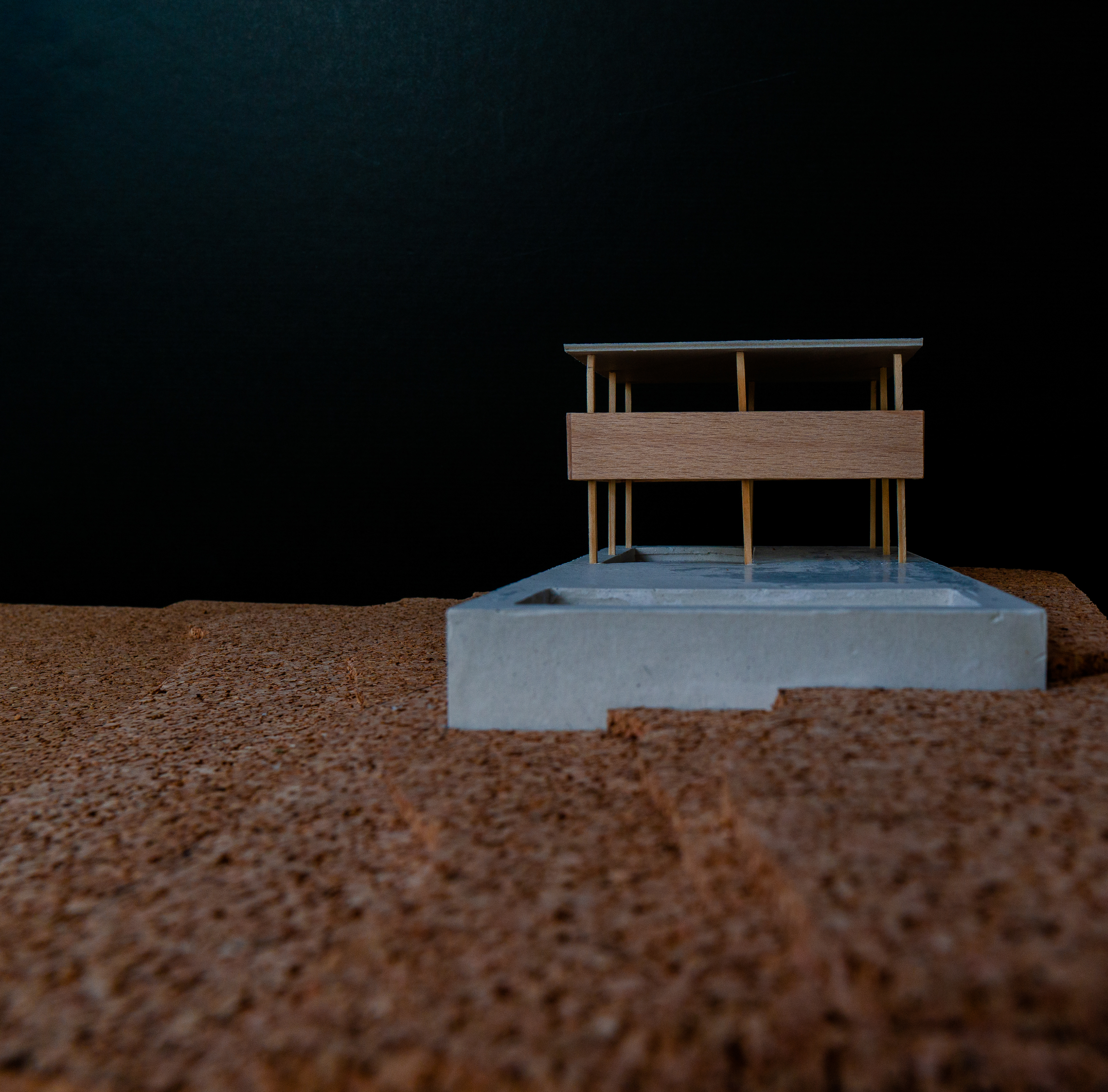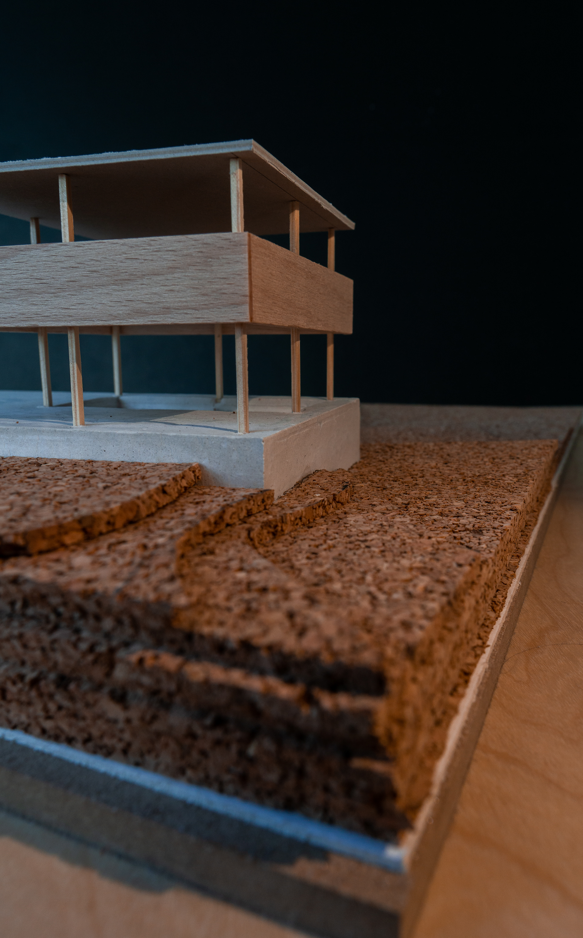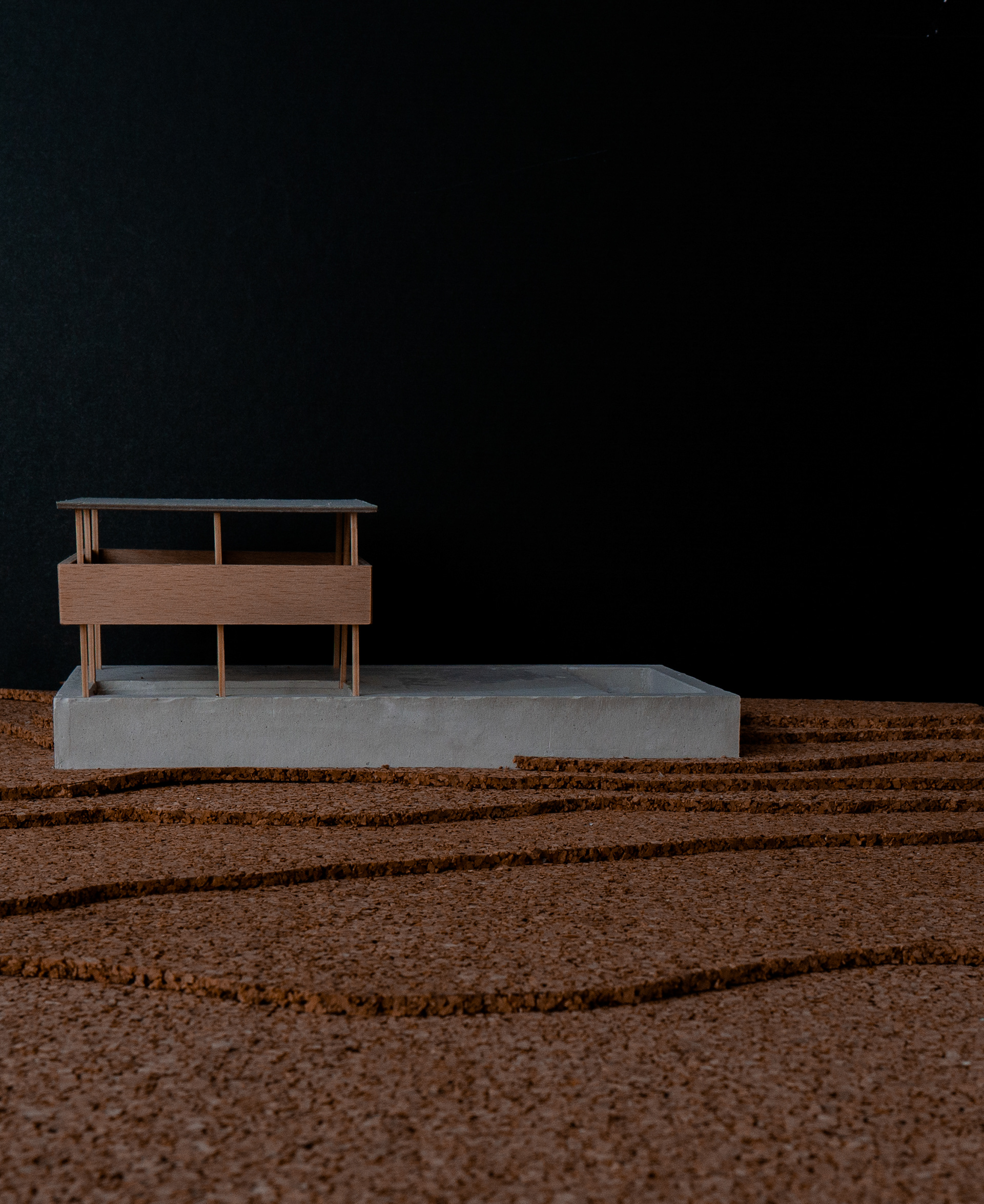 Building this model was part of a detailed analysis about the Atelier Lapidus by Arrhov Frick Architects. The base, which is undoubtedly the most imposing design aspect, was build using plaster. my friend Paul and I poured the fluid plaster into a form, which was specifically designed and built to get the same Dimensions as the original. In order to indicate the rough buildingground, we used cork and its unmatchable material-esthetic.