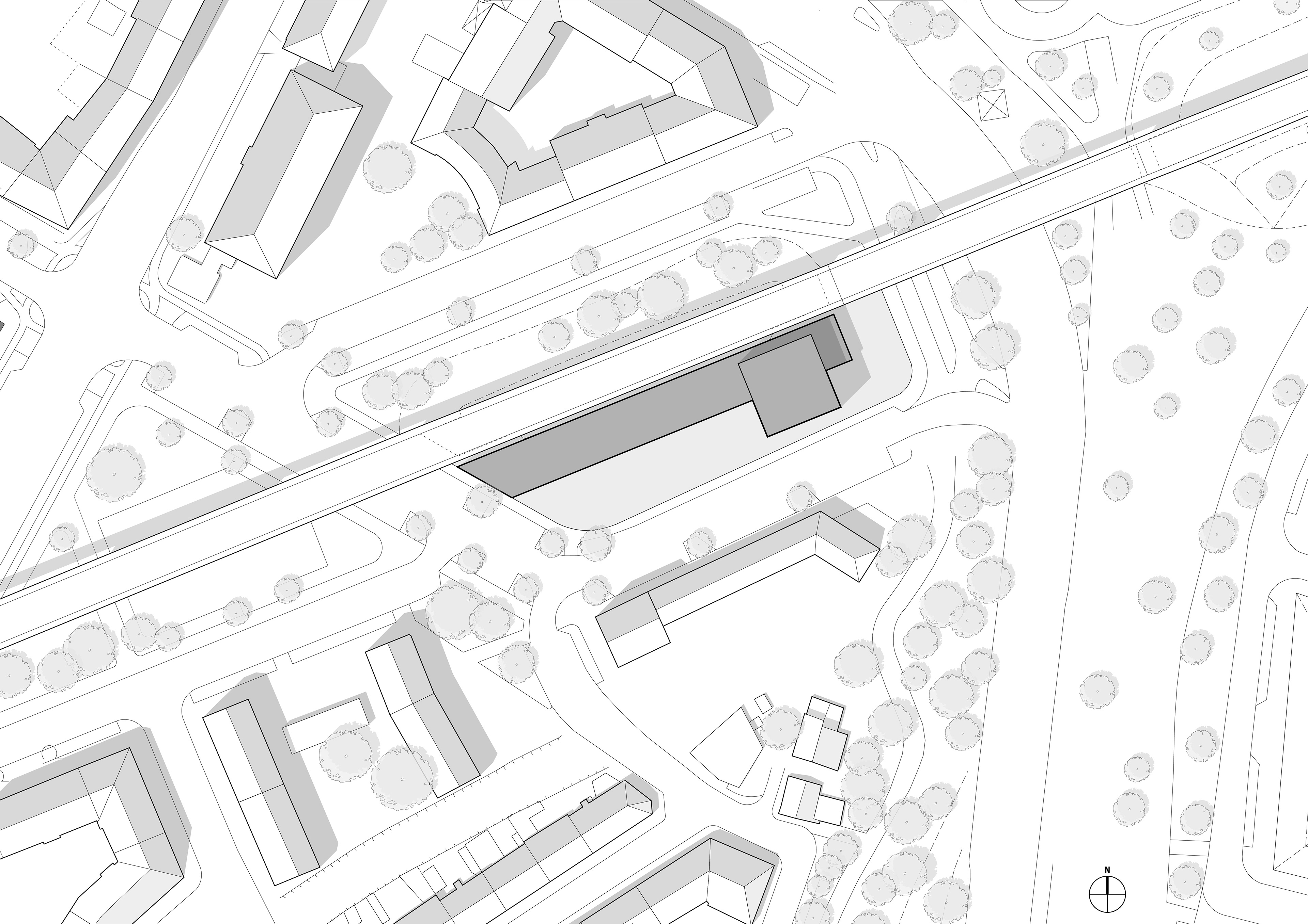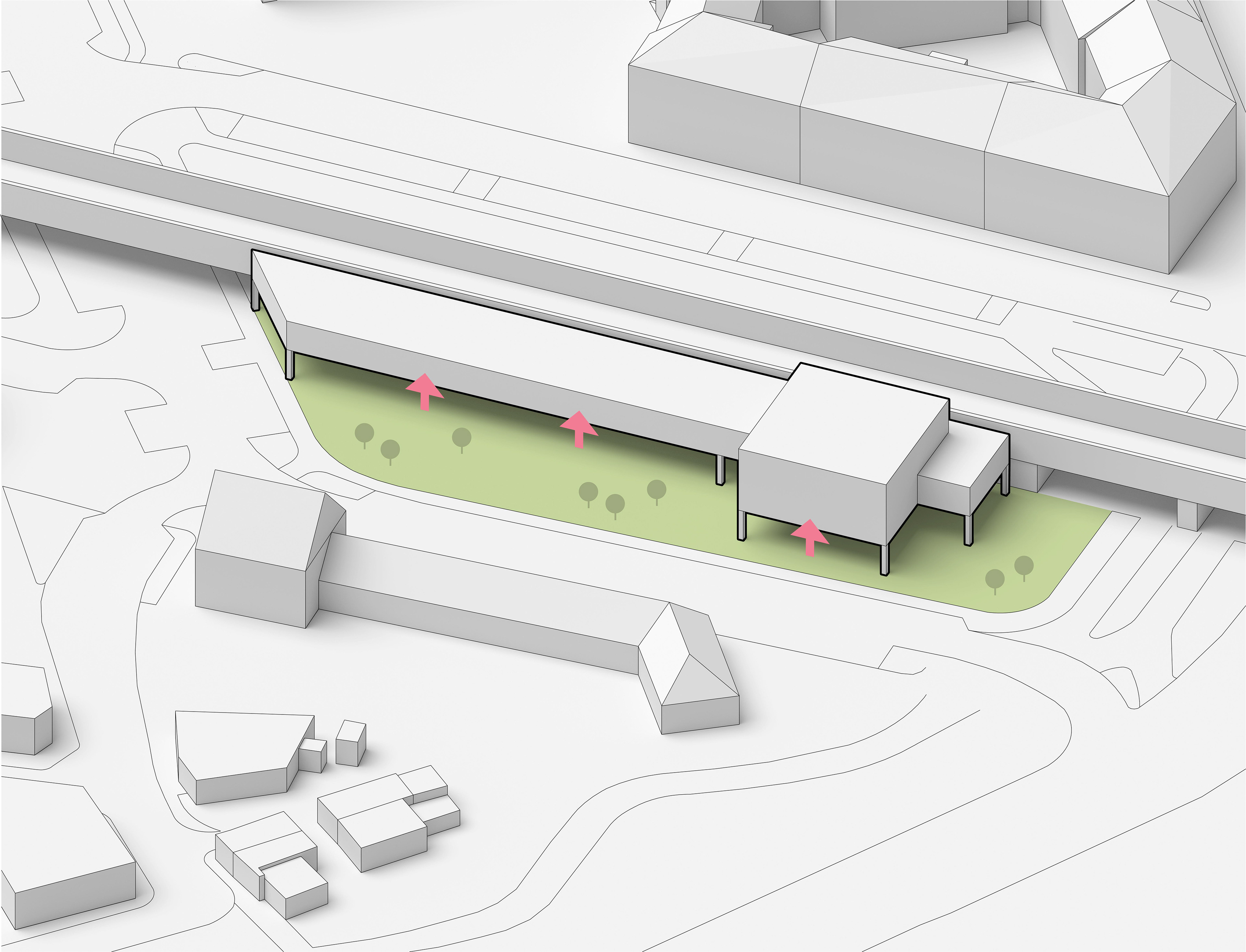 Die Bahnlinie vom Haupt- zum Ostbahnhof zerschneidet mit einem hohen Damm Giesing. In ihrem Schatten liegt ein unbeachtetes Grundstück, das derzeit der Öffentlichkeit nicht zugänglich ist und für gemeinnützige Initiativen zur Verfügung steht. Diese nutzen das Grundstück aber nur temporär. Das Grundstück kann außerhalb der Böschung als eben angenommen werden. Die Böschung zur Bahn hin darf nicht abgetragen, kann aber weiter aufgeschüttet werden. Sie kann zur Erschließung der Neuplanung verwendet werden. Auch die bestehende Fluchttreppe von den Bahngleisen kann, sofern stets frei für Rettungswege in die Außenanlagen integriert werden.